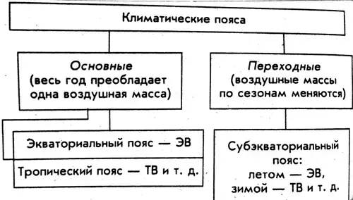 Объяснение учителя: введение понятия "климатический пояс", основания для выделения климатических поясов. Для того чтобы учащиеся лучше поняли различия между основными и переходными климатическими поясами и их особенности, им можно предложить составить схему(рис.1):