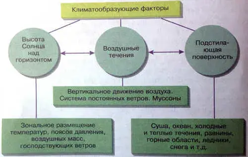 Объясняется это тем, что на формирование климата местности большое влияние оказывает подстилающая поверхность, и внутри климатического пояса формируется различные типы климатов. Таким образом, на формирование климата любой территории Земли влияют три причины, называемые климатообразующими факторами.
