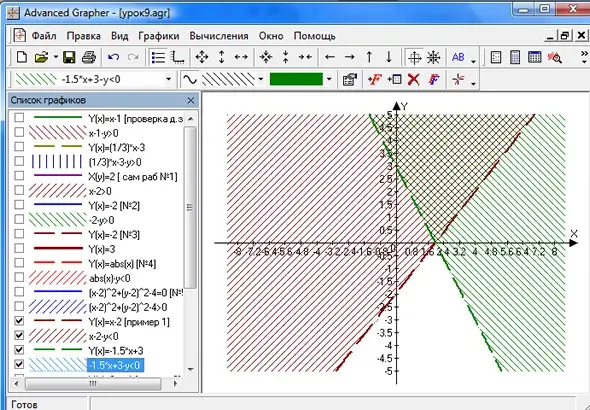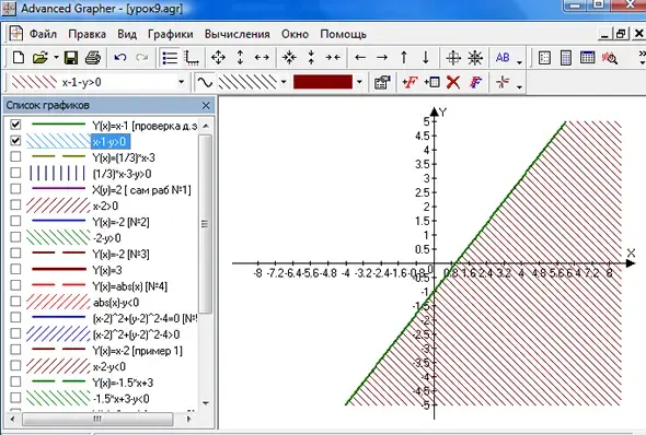 Чтобы проверить решение второго неравенства отмените построение предыдущих двух и выберите следующие две)