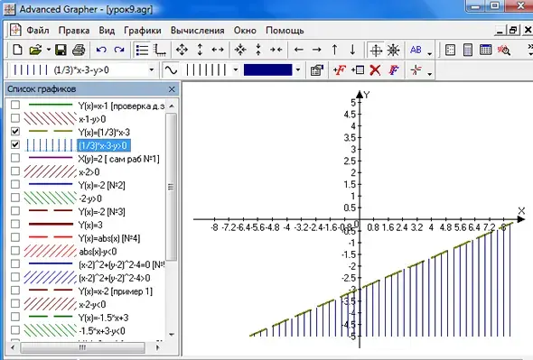 Проверим решение №484б и г с помощью программы «Advanced Grapher» на интерактивной доске. (Учитель открывает готовый файл Приложение 1.agr. В окне слева выбирает первую и вторую функцию