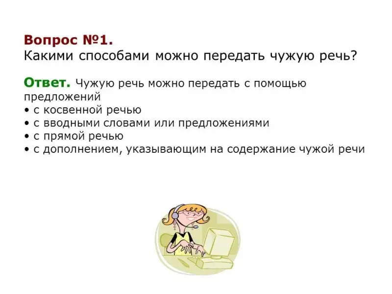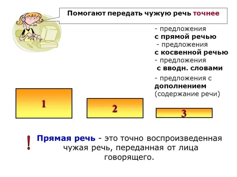 Слайд №5. Для запоминания учитель еще раз перечисляет способы передачи речи вслух, они появляются на экране. Какой способ самый точный из них? (Ответы учеников.)