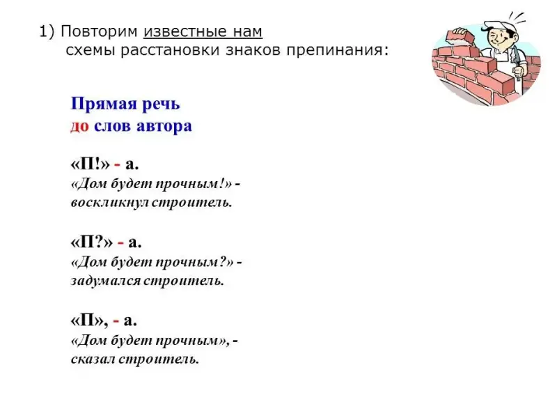 У.: Запишите предложение под диктовку. "Дом будет прочным!" - воскликнул строитель. Подпишите, какая часть предложения - прямая речь, а где слова автора.