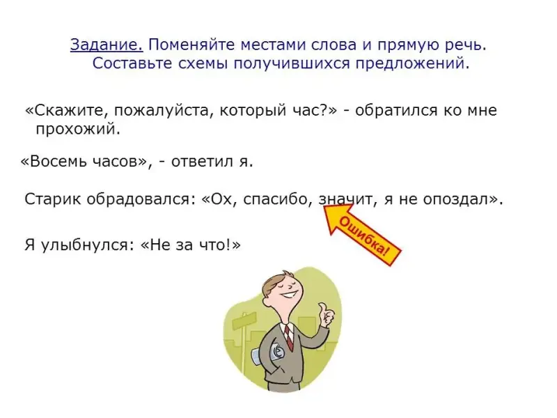 У. (учитель): Тема урока - прямая речь. Наша задача: уточнить, какими способами можно передавать чужую речь, как в этом может помочь прямая речь, какие знаки препинания для этого нужны.
