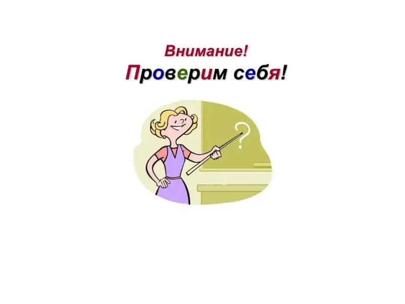 У.: Подведем итог. Закроем тетради. Работаем в парах. На экране будет появляться вопрос. Ваш сосед по парте вполголоса должен ответить вам на него, а на следующий - вы ему. Каждый проверяет сам себя. (Демонстрируются вопросы, пауза для ответов в парах, затем - проверка по слайду.)