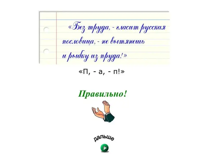Слайды №14-15. "Без труда не выловишь и рыбку из пруда". Упражнение на закрепление нового материала. Выбор 1-го из 2-х вариантов написания (устно всем классом).