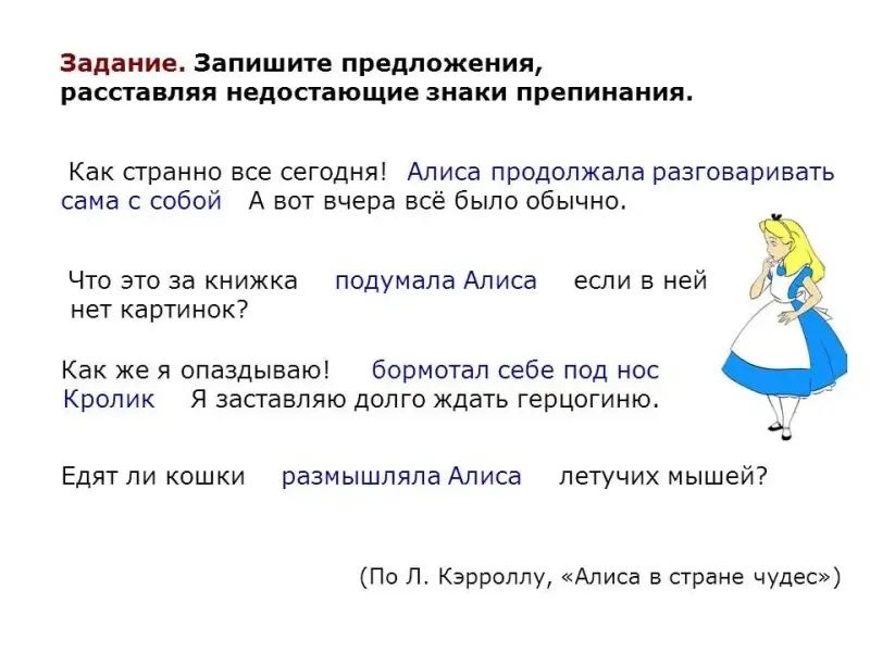 "Как странно все сегодня! - Алиса продолжала разговаривать сама с собой.- А вот вчера все было обычно". "Что это за книжка, - подумала Алиса, - если в ней нет картинок?" "Как же я опаздываю! - бормотал себе под нос Кролик. - Я заставляю долго ждать герцогиню". "Едят ли кошки, - размышляла Алиса, - летучих мышей?" (По Л. Кэрроллу, "Алиса в стране чудес")