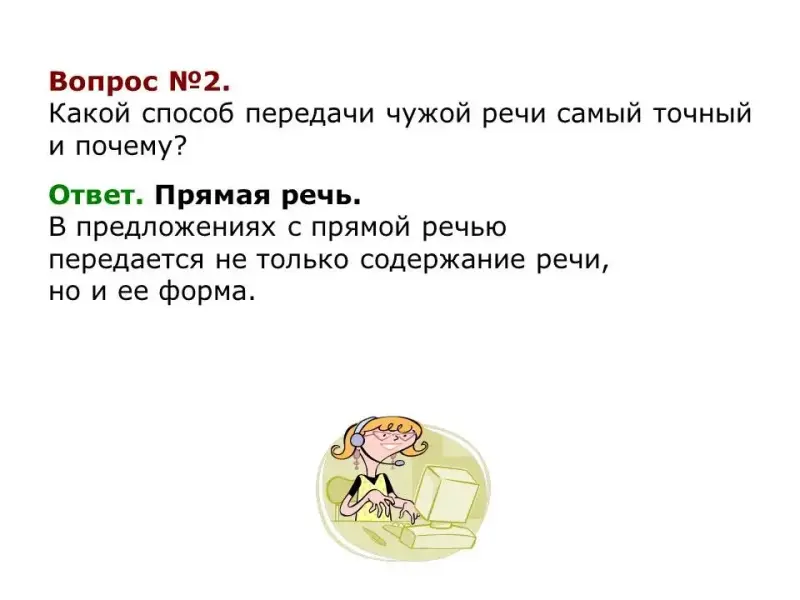 У.: Уточним, почему прямая речь - действительно наиболее точный способ из перечисленных.