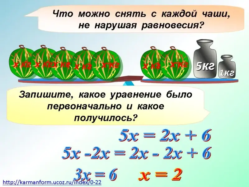 Давайте посмотрим на рисунок весов, представленный на доске. (Слайд №8) Что нам нужно сделать, чтобы уровновесить правую и левую часть?