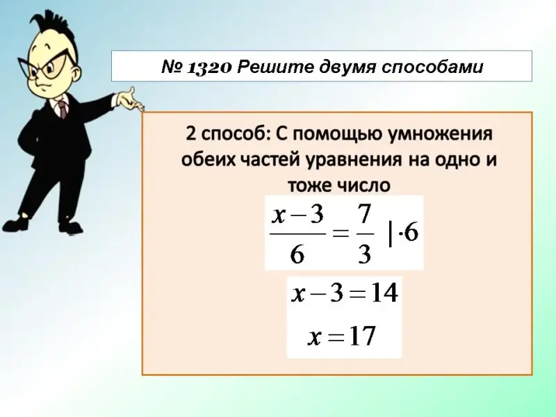 2 способ: С помощью умножения обеих частей уравнения на одно и то же число. (Слайд №15)