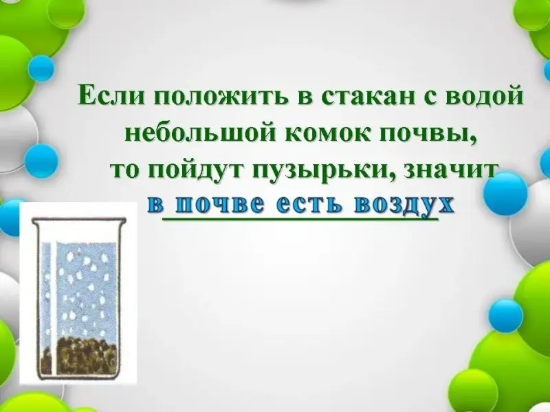 1. Если положить в стакан с водой небольшой комок почвы, то пойдут пузырьки, значит _______________(в почве естьвоздух.)