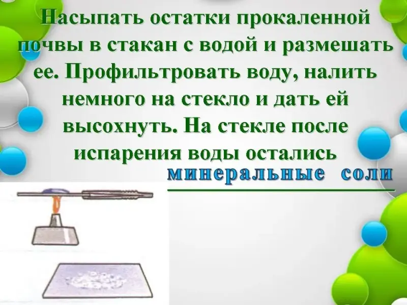 Вывод: в почве есть минеральные соли. (вывод записывают в тетрадь)