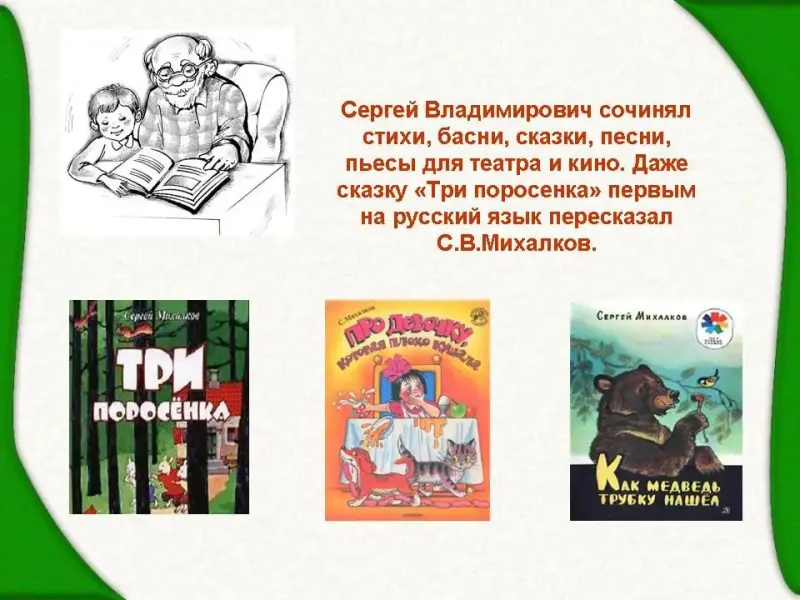 Это: стихи, басни, сказки, песни, пьесы для театра и кино. Даже сказку "Три поросенка" первым на русский язык пересказал Михалков.
