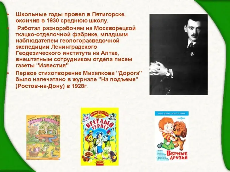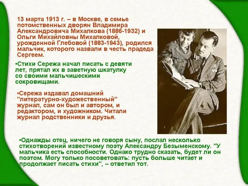 4 ученик: Однажды отец, ничего не говоря сыну, послал несколько стихотворений известному поэту Александру Безыменскому. "У мальчика есть способности. Однако трудно сказать, будет ли он поэтом. Могу только посоветовать: пусть больше читает и продолжает писать стихи", - ответил тот. Уже в 15 лет у Михалкова вышли первые публикации.