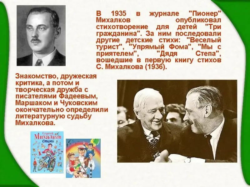 4 ученик: В 1935 в журнале "Пионер" Михалков опубликовал стихотворение для детей "Три гражданина". За ним последовали другие детские стихи: "Веселый турист", "Упрямый Фома", "Мы с приятелем", "Дядя Степа", вошедшие в первую книгу стихов С.В. Михалкова (1936).