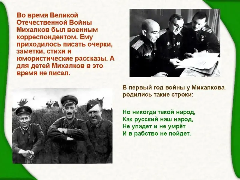 Во время Великой Отечественной Войны Михалков был военным корреспондентом. Ему приходилось писать очерки, заметки, стихи и юмористические рассказы для взрослых. А для детей Михалков в это время не писал.