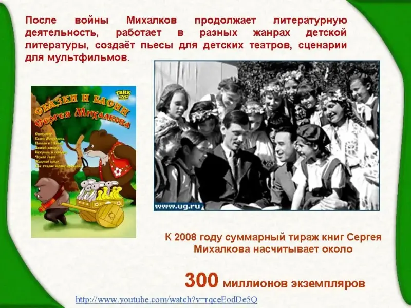 3 ученик: Знакомство, дружеская критика, а потом и творческая дружба с писателями Фадеевым, Маршаком и Чуковским окончательно определили литературную судьбу Михалкова.