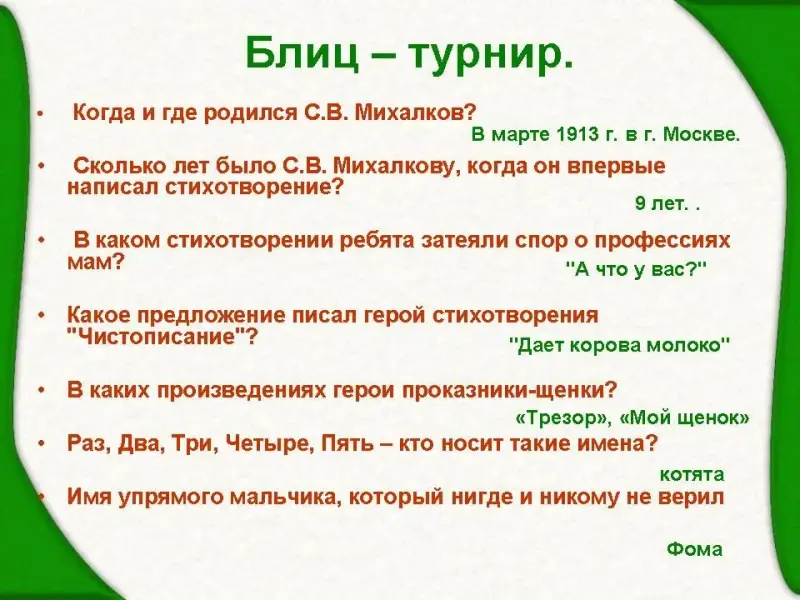 Литературная викторина для учащихся начальной школы по произведениям С.В. Михалкова