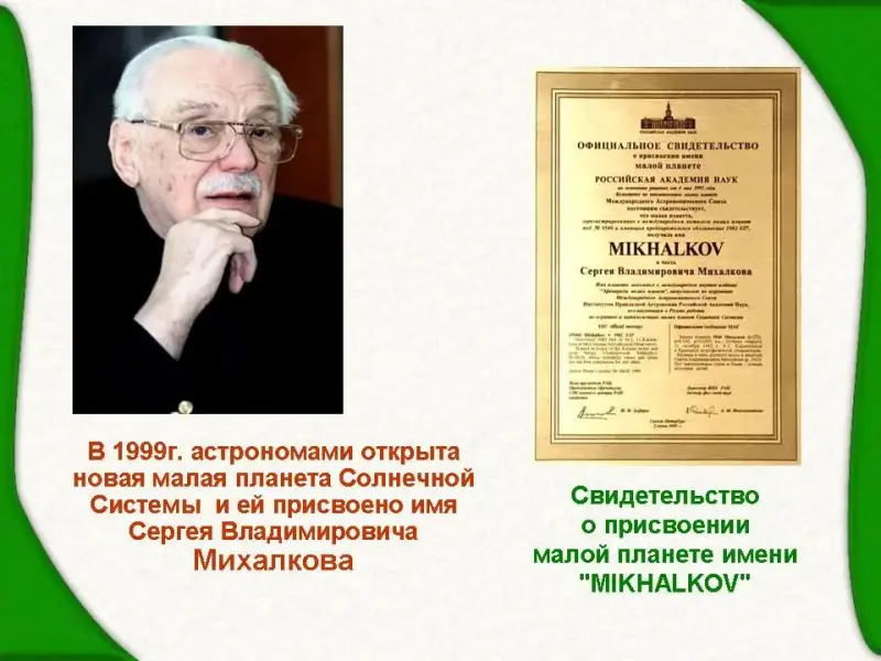 В 1999 г. астрономами открыта новая малая планета Солнечной Системы и ей присвоено имя Сергея Владимировича Михалкова