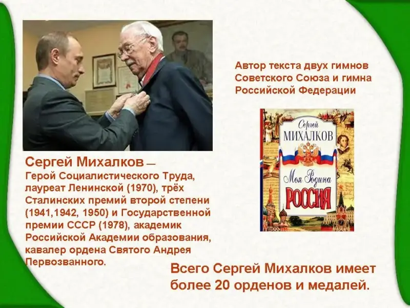 Сергей Михалков - Герой Социалистического Труда, лауреат Ленинской (1970г.), трёх Сталинских премий второй степени (1941,1942, 1950г.) и Государственной премии СССР (1978г.), академик Российской Академии образования, кавалер ордена Святого Андрея Первозванного.