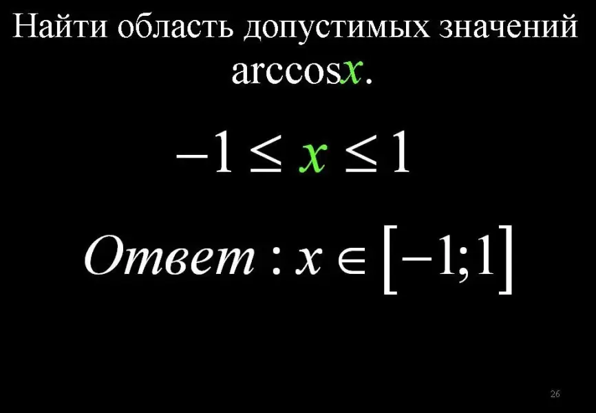 Нахождение области допустимых значений выражения arccosz c последующей самопроверкой - слайды 26-27.