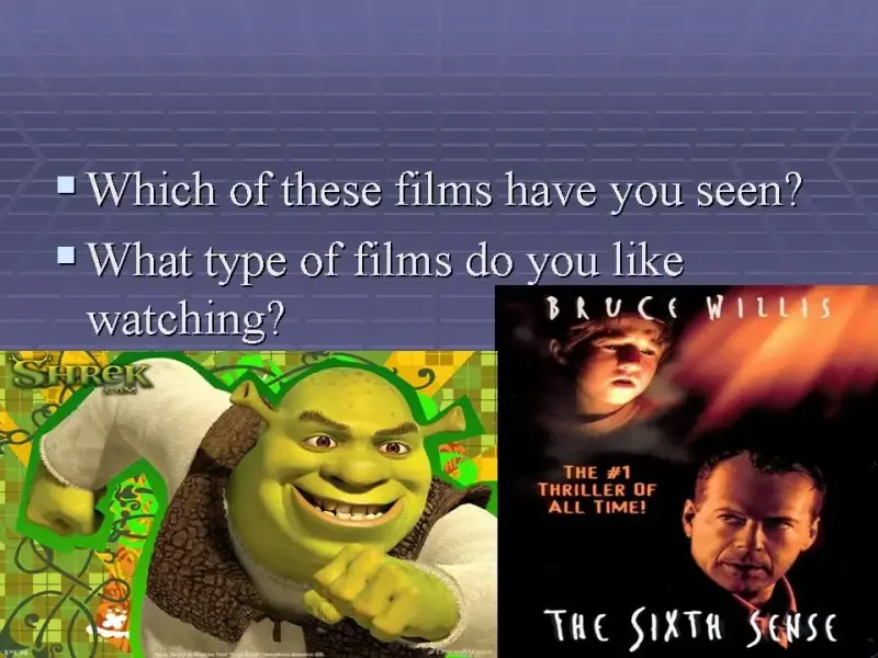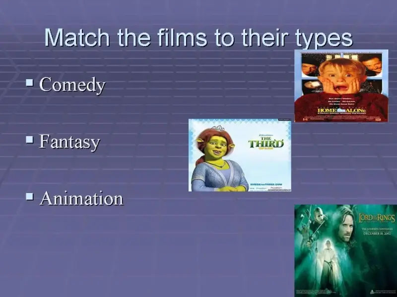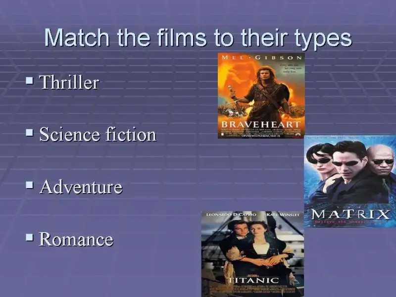 2 Match the films to their types. (cлайд 3 - ,, Titanic,, , ,, The Lord of the ring,, , ,,Brave heart,, , ,, Shrek,, , ,, The Matrix Reloaded,, , ,, Home Alone,, )