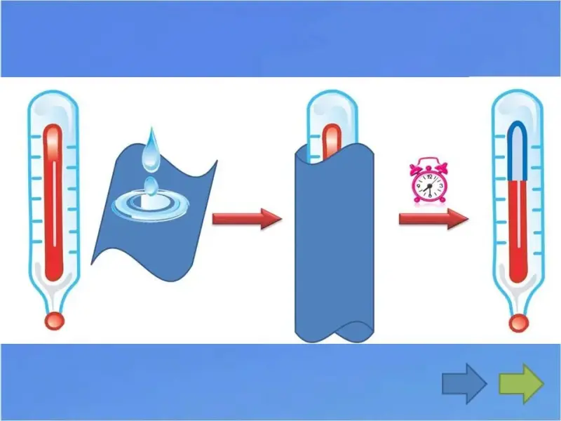 Ход опыта: Дети рассматривают термометр, отмечают показания. Завертывают термометр в мокрую ткань и кладут в теплое место. Предполагают, что должно произойти с показаниями.