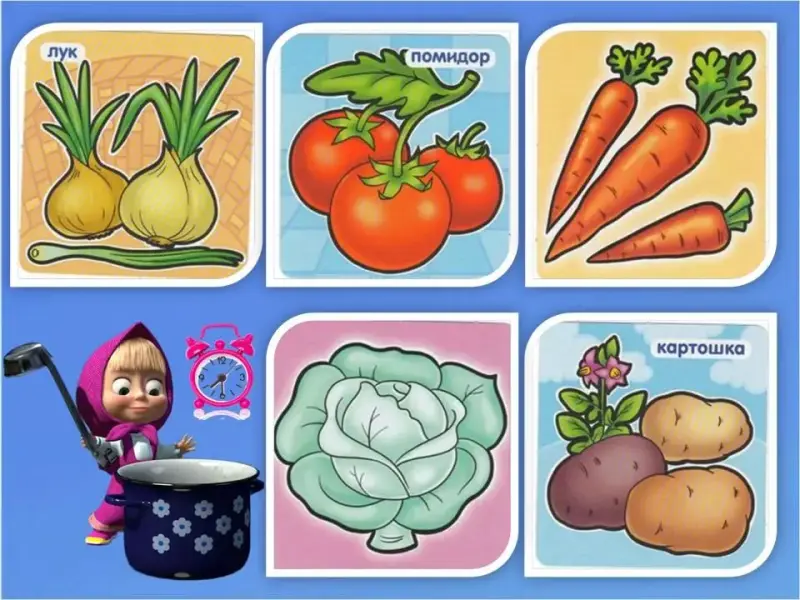 Дети делятся на 2 команды. На экране открывают задание, в котором перечислены овощи необходимые для приготовления. Сначала выясняют: какое блюдо решила приготовить Маша, а затем проводится эстафета (чья команда быстрее принесет все необходимые овощи из огорода).
