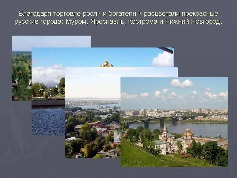 Благодаря торговле росли и богатели и расцветали прекрасные русские города: Муром, Ярославль, Кострома и Нижний Новгород. Слайд 6