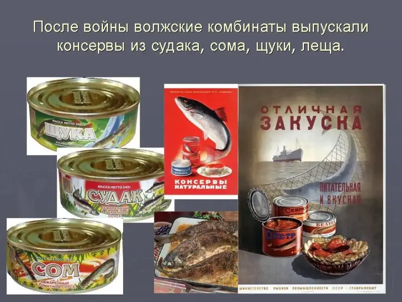 После войны волжские комбинаты выпускали консервы из судака, сома, щуки, леща. Волга щедро делилась с людьми своим богатством. Потом появилась знаменитая «Килька в томате» - подарок седого Каспия. И банки эти стали самой демократичной едой на всем пространстве Советского Союза. Они были в рюкзаках геологов и туристов, в солдатских вещмешках и авоськах домохозяек. Их выпускали миллионами условных банок. Слайд17