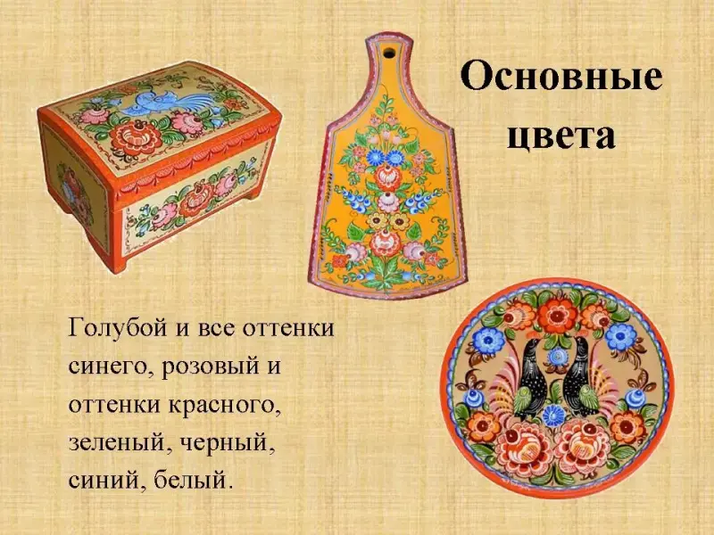 Городецкая роспись имеет основные цвета: голубой и все оттенки синего, розовый и оттенки красного, зеленый, черный, синий, белый.
