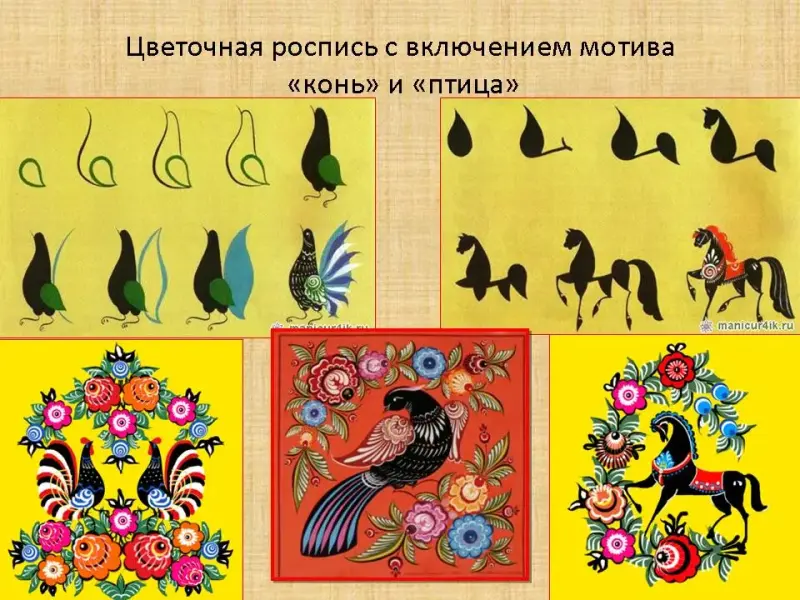 (изображения изделий с городецкой росписью, варианты композиций, схема изображения основных элементов расположены на доске)