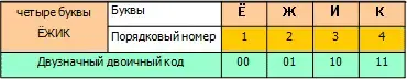 Учитель: Получим двоичный код каждого символа алфавита из двух цифр.
