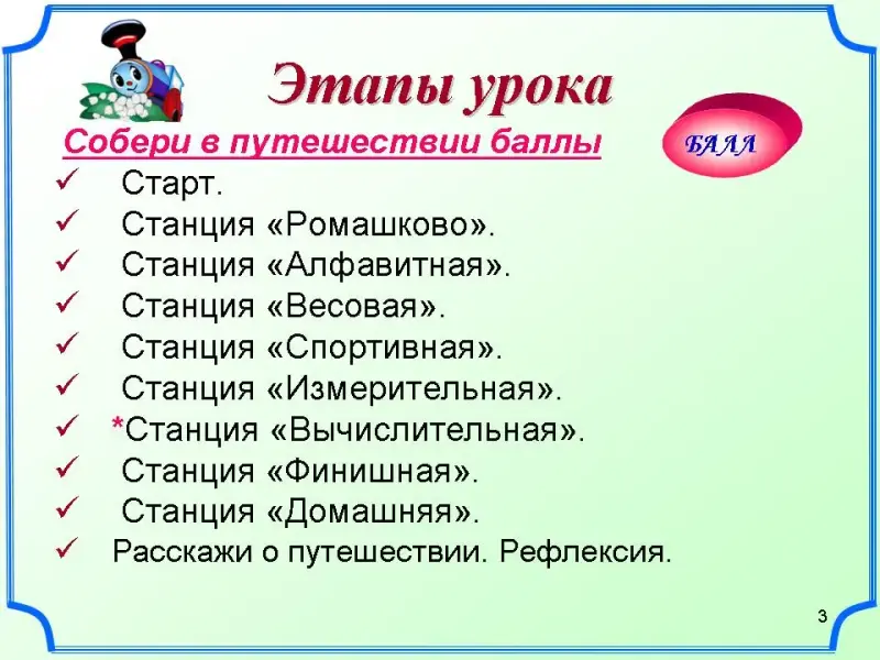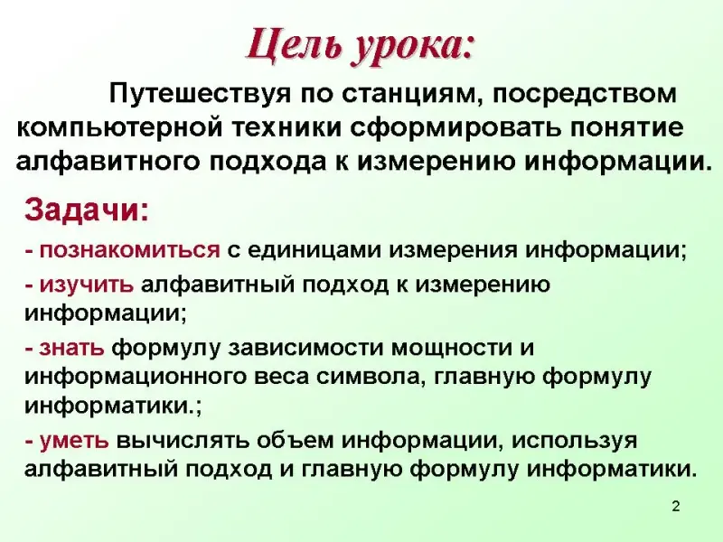 Цель урока: Путешествуя по станциям, посредством компьютерной техники сформировать понятие алфавитного подхода к измерению информации.