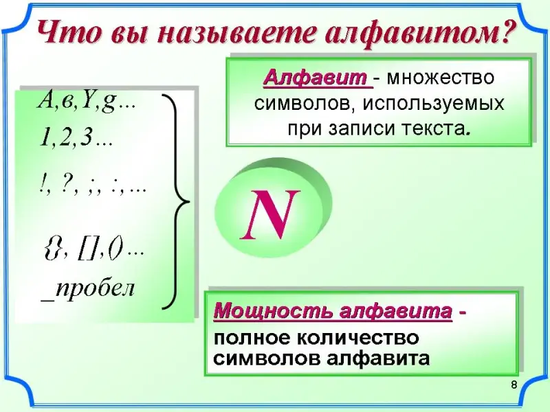 - что такое "алфавит", "мощность алфавита", "алфавитный подход в измерении информации";