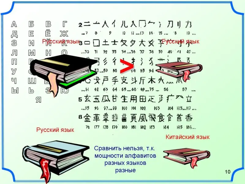 - А можно ли сравнить в какой книге информации больше, если книги написаны на разных языках? (Нет, не можем сравнить, т.к. мощность алфавитов разных языков разная).