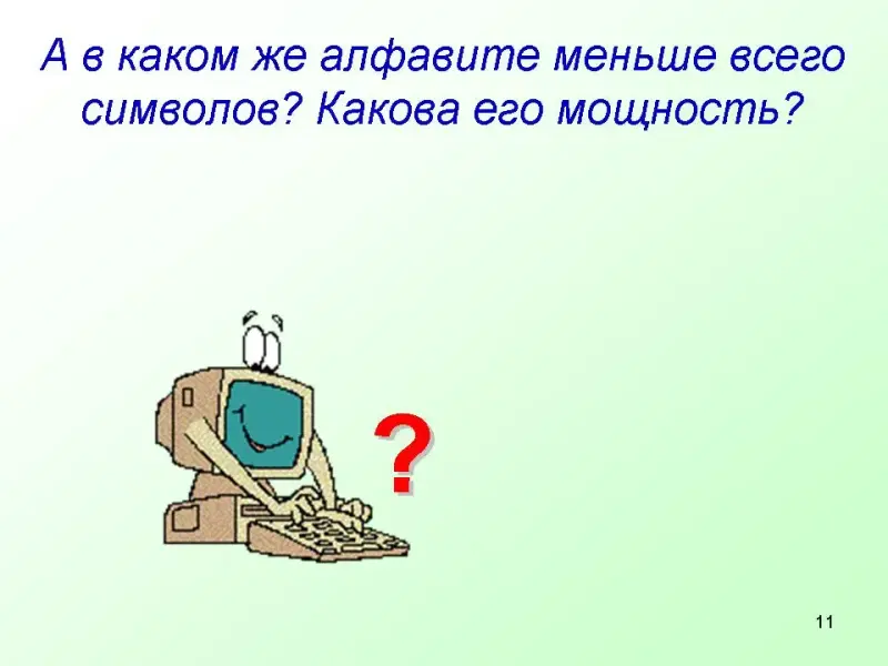 Вы научились определять количество информации, которое содержится в сообщениях, уменьшающих неопределенность наших знаний, т.е. мы рассматривали информацию со своей точки зрения - с позиции человека. Для нас количество информации зависит от ее содержания, понятности и новизны. Однако любое техническое устройство не воспринимает содержание информации. Здесь не работают «неопределенность знаний» и «вероятность информации». Поэтому в вычислительной технике используется другой подход к измерению информации - алфавитный.