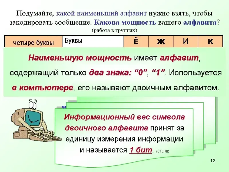 Учащиеся приходят к выводу: Наименьшую мощность имеет алфавит, содержащий только два знака "0", "1". Используется в компьютере, его называют двоичным алфавитом.