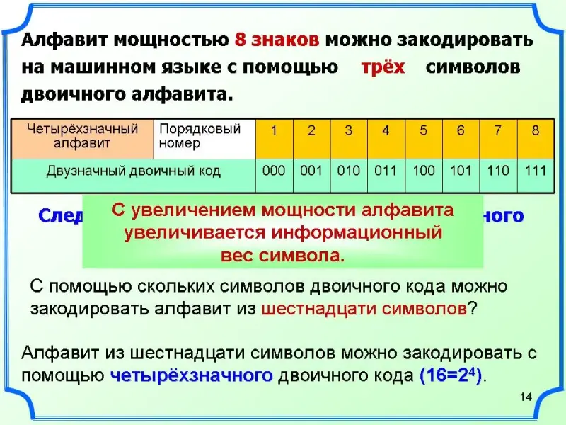 Ученики: Алфавит из шестнадцати символов можно закодировать с помощью четырёхзначного двоичного кода (16=24).