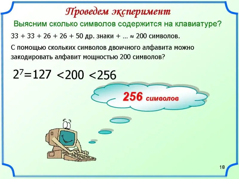 Алфавит, из которого составляется текст документа на компьютере, содержит символы: строчные и прописные русские и латинские буквы, цифры, знаки пунктуации и арифметических операций, всевозможные скобки, знаки препинания… 33 + 33 + 26 + 26 + 50 др. знаки + … » 200 символов.