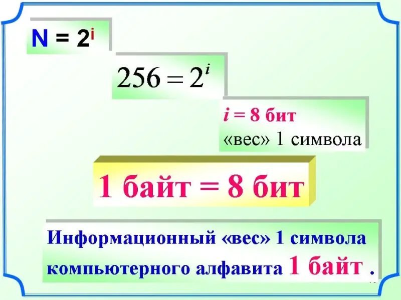 Согласно формуле N=2i = 256 видно, что i= 8 бит байт = 8 бит (Приложение 4)