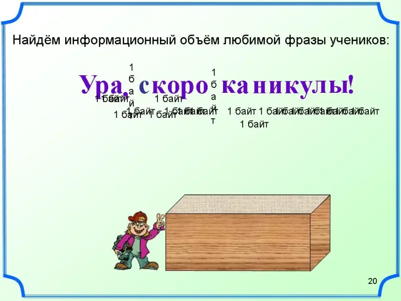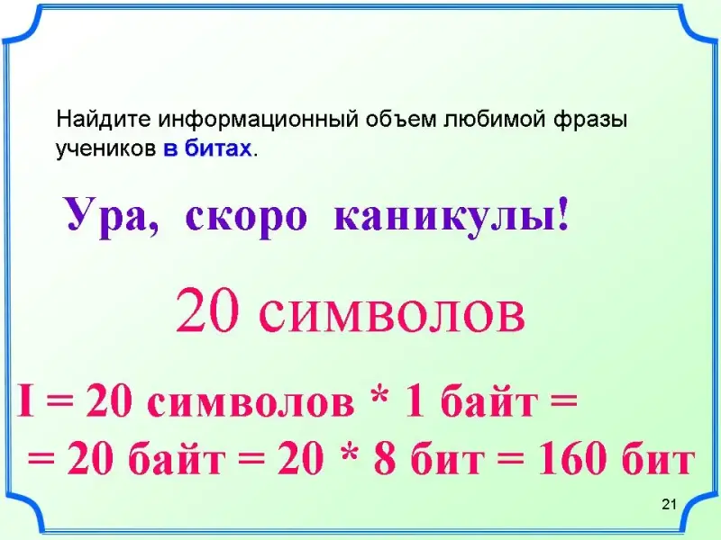 Решим задачу: Найдём информационный объём любимой фразы учеников в битах с учетом пробелов и знаков препинания: Ура скоро каникулы! Ответ: 20 символов. Переведем в биты. I=20 символов*1 байт=20 байт=20*8 бит=160 бит