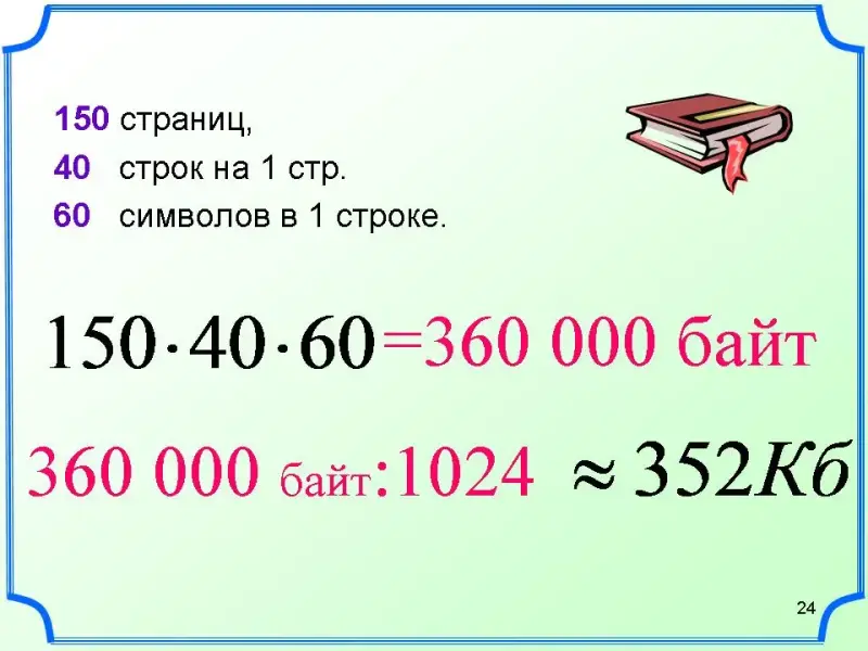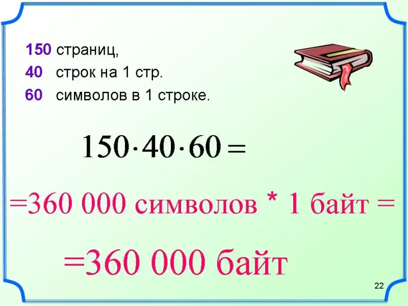Решим задачу: Сколько информации содержится в книге 150 страниц, 40 строк на 1 стр. 60 символов в 1 строке.