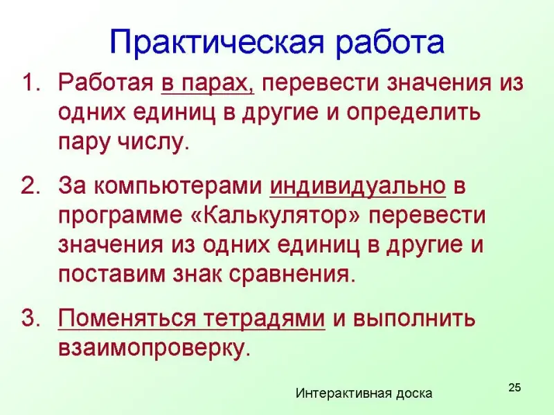 1. Работая в парах, перевести значения из одних единиц в другие и определить пару числу.