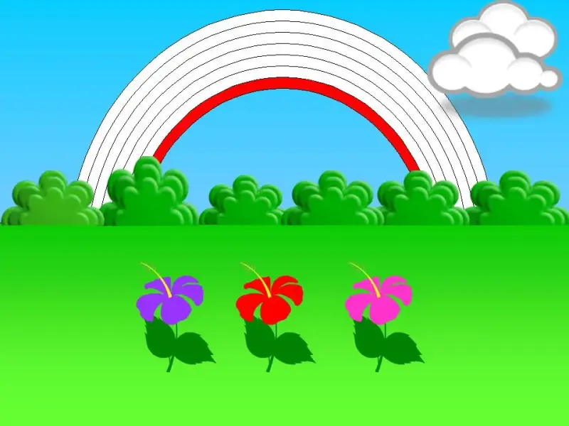 Ребята, смотрите, мы прилетели в волшебную страну на сказочную поляну. (слайд 3) На небе появились тучи, и пошёл дождь. Дождь закончился, и выглянуло солнышко, а что ещё появилось на небе? (Радуга) (слайд 4)