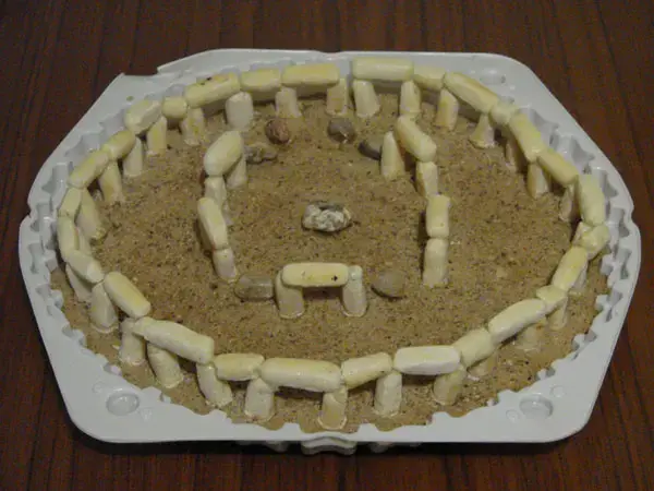 (Показывает модель календаря друидов Стоунхэнджа, которую учащиеся всем классом сделали на уроке технологии из солёного теста. Модель действующая. При помощи лазерной указки, символизирующей первый солнечный луч, можно увидеть момент наступления нового года.)