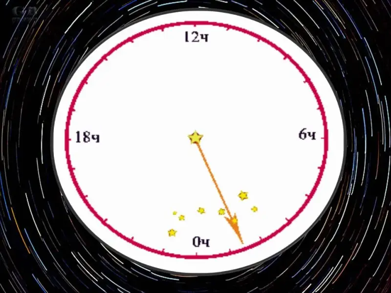 Минутная Стрелочка: Да! А потом люди научились определять время более точно - днём по солнцу, а ночью по звёздам. Люди заметили, что звёзды на небе медленно двигаются. Все, кроме одной. Это Полярная звезда... А это - созвездие Большая Медведица. За сутки Большая Медведица обходит вокруг Полярной звезды полный круг, а за ночь - полкруга. Вот и получается, что на небе есть настоящие ночные часы со звёздной стрелкой! (слайды 8, 9)