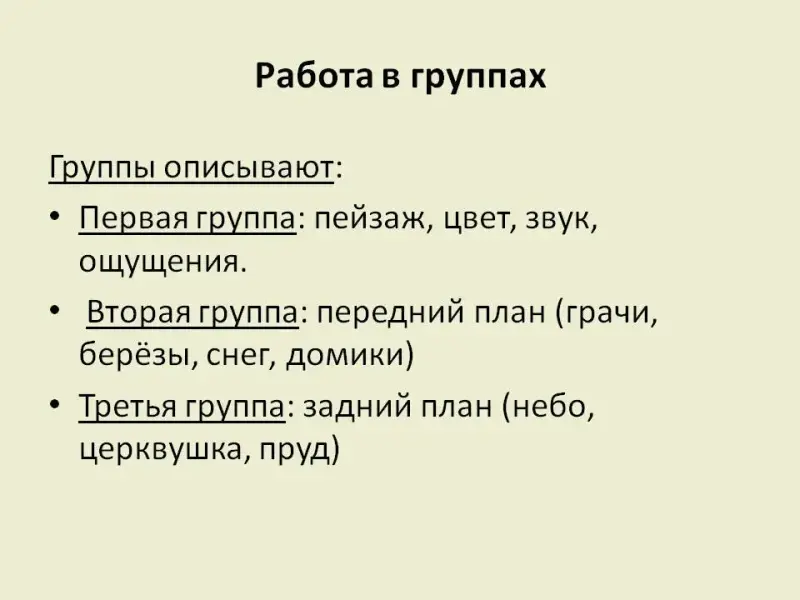 - о чём напишем дальше? (подробнее опишем пейзаж, передний и задний вид картины, затем перейдём к описанию грачей).
