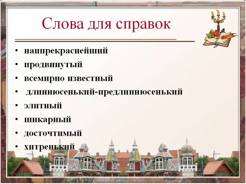 - Помогите мне, пожалуйста, «разукрасить» обращение, используя следующие слова для справок: наипрекраснейший, продвинутый, шикарный, досточтимый, хитренький, всемирно известный,