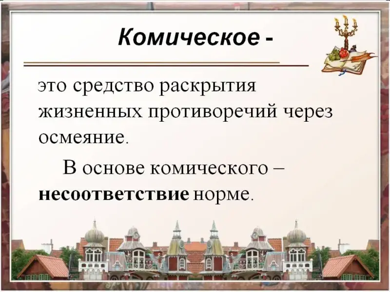 Комическое - это средство раскрытия жизненных противоречий через осмеяние. В основе комического - несоответствие норме.