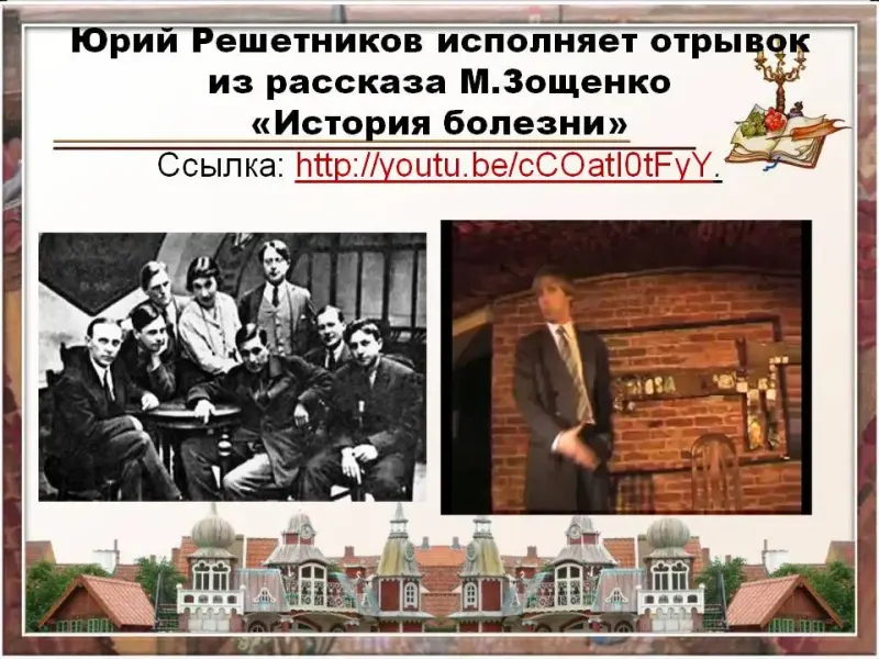 Оборудование: портрет М.М.Зощенко, иллюстрации к эпизодам рассказа; компьютер, мультимедийный центр для показа видеофрагментов.